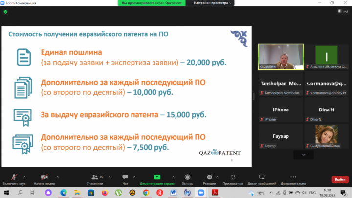 On 18 August, Qazpatent held a training webinar for entrepreneurs at the Qolday Centre for Entrepreneurship on the topic: "Intellectual property in Entrepreneurship ".