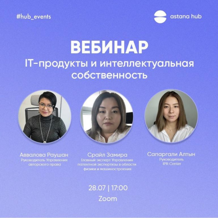 On July 28, 2021 Kazpatent in cooperation with the Astana Hub International Technopark of IT start-ups held a webinar for start-up owners on the protection of rights on IT products in videoconference format.