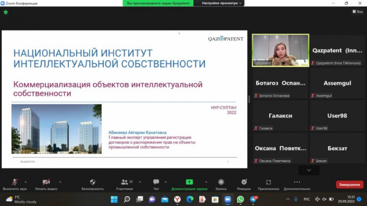 On 29 September, Qazpatent held a training webinar for entrepreneurs at the Qolday Centre for Entrepreneurship on the topic: "Intellectual property in Entrepreneurship ".