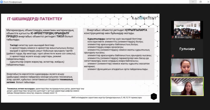Kazpatent сарапшылары өнертабыстар мен пайдалы модельдерді патенттеу: отандық және халықаралық дерекқорлар бойынша патенттік іздеу, IT-шешімдерді патенттеу, сондай-ақ зияткерлік меншік объектілерін коммерцияландыру және зияткерлік меншік объектілерін қорғау мәселелерін қамтыды.