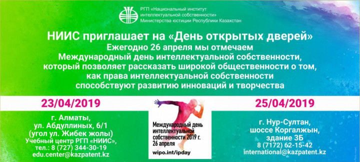 Нұр-сұлтан қаласында өтетін Ашық есік күніне қатысу үшін 2019 жылдың 23 сәуіріне дейін +7 (7172) 62-15-42 нөміріне қоңырау шалу немесе international@kazpatent.kz поштасына хабарлама жіберу арқылы алдын ала тіркеуден өтулеріңізді сұраймыз. Байланыстағы тұлға: Сәуле Молдабек, даму және халықаралық ынтымақтастық басқармасының бас маманы.