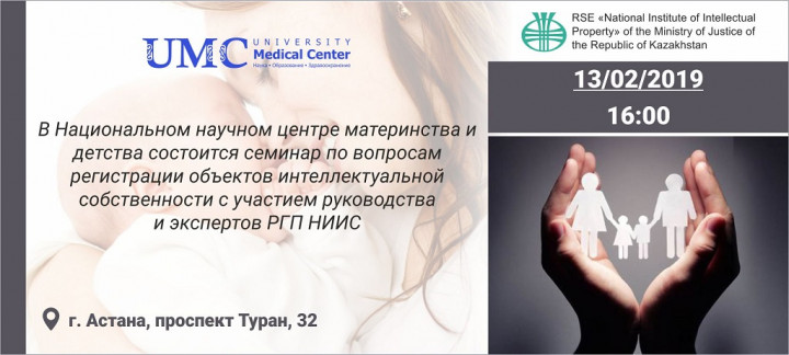 2019 жылғы 13 ақпанда Ана мен бала ұлттық ғылыми орталығында «ҰЗМИ» РМК басшылығы мен сарапшыларының қатысуымен зияткерлік меншік объектілерін тіркеу мәселелері бойынша семинар өтеді.
