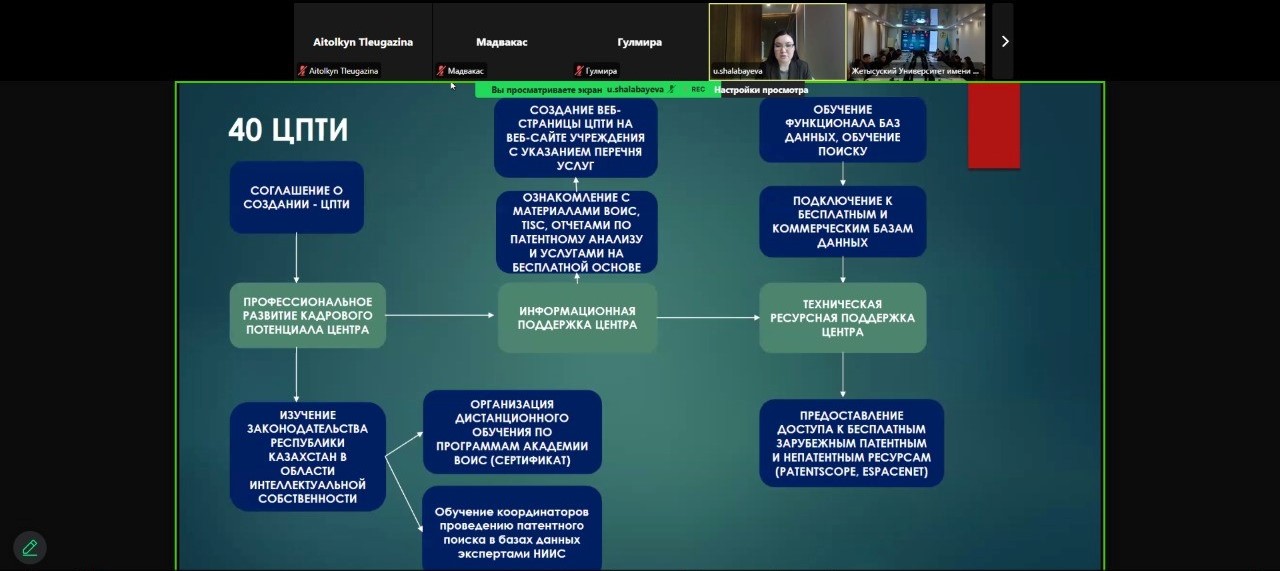Семинардың модераторы ретінде, сондай-ақ Технологиялар мен инновацияларды қолдау орталықтарының (ТИҚО) қызметі туралы Казпатенттің Патенттік зерттеулер және Технологиялар мен инновацияларды қолдау орталықтарын (ТИҚО) үйлестіру бөлімінің басшысы - Шалабаева Ұлдана Каратайқызы қысқаша баяндама жасады. Сонымен қатар, университет 2022 жылдың 27 сәуірінен бастап Казпатенттің үйлестіруімен жүзеге асырылатын Технологиялар мен инновацияларды қолдау орталықтары (ТИҚО) жобасының қатысушысы болып табылады және зияткерлік меншікті басқару саласындағы білімді арттыру бағытында белсенді жұмыс жүргізуде.