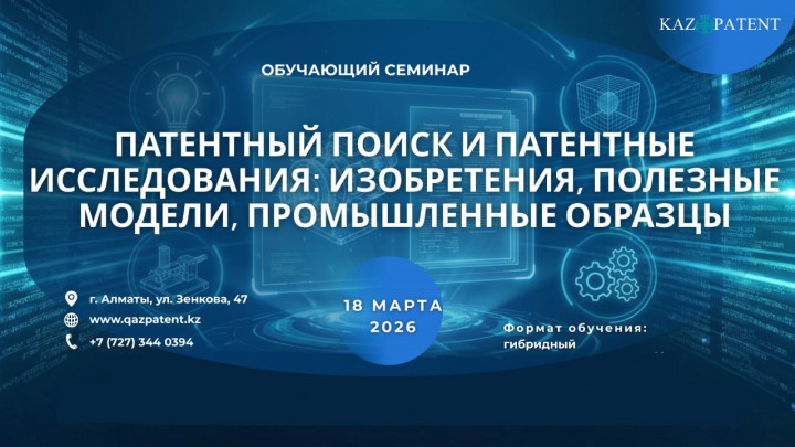 Kazpatent филиалы Сізді өнертабыстарға, пайдалы модельдерге және өнеркәсіптік үлгілерге қатысты патенттік іздестіру және патенттік зерттеулер жүргізу мәселелеріне арналған бір күндік оқыту семинарына қатысуға шақырады.