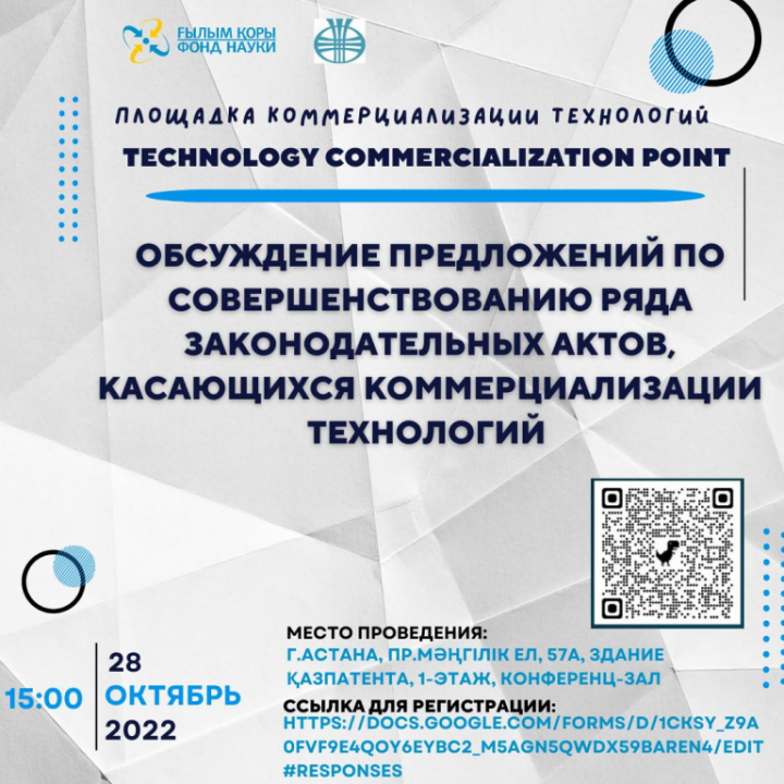 В стенах РГП «Национальный институт интеллектуальной собственности» (далее - Казпатент) планируется проведение мероприятия «Площадка коммерциализации технологий» («Technology Commercialization Point») для обсуждения предложений по совершенствованию законодательства в области коммерциализации технологий. Организатором мероприятия является АО «Фонд науки».