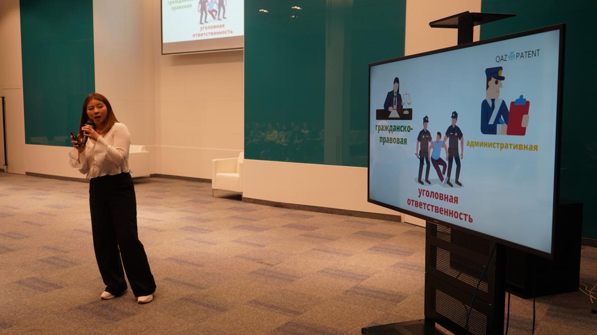 Перед учащимися выступили руководитель Центра по правам интеллектуальной собственности (IPR Center) Алтын Сапарғали и главный эксперт Управления экспертизы товарных знаков и наименований мест происхождения товаров Азат Накенов, расскрыв для них основные аспекты правовой охраны всех товарных знаков и контрафактной деятельности.