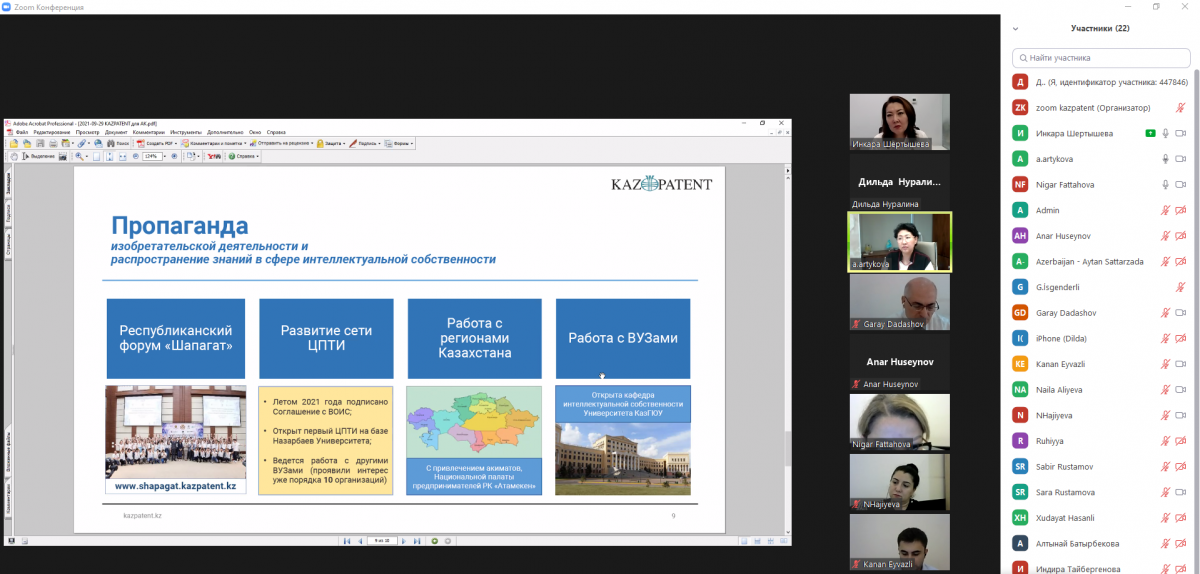 От лица казахстанской стороны онлайн встречу открыла заместитель директора Казпатента Айдын Артыкова, которая ознакомила слушателей с деятельностью Казпатента и подчеркнула значимость проведения подобных тренингов в целях достижения результатов по развитию двусторонних связей.