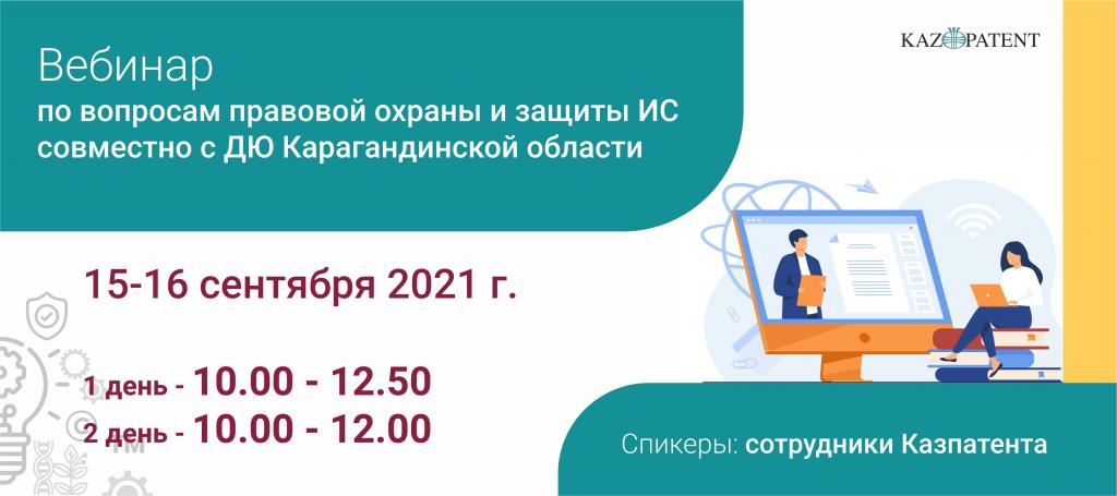 15 - 16 сентября 2021 года Казпатент совместно с ДЮ Карагандинской областипроведет вебинар по вопросам правовой охраны и защиты интеллектуальной собственности.