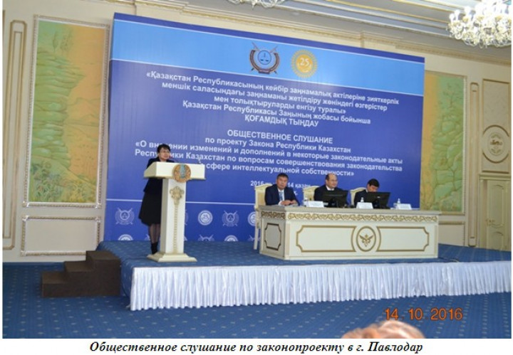 14 октября т.г. в г. Павлодар состоялось Общественное слушание по проекту Закона Республики Казахстан «О внесении изменений и дополнений в некоторые законодательные акты Республики Казахстан по вопросам совершенствования законодательства в сфере интеллектуальной собственности», организованное Министерством юстиции РК.