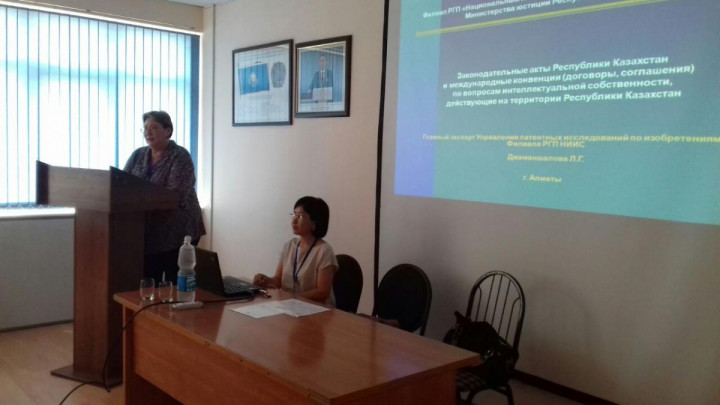 Учебным центром филиала РГП «НИИС» г.Алматы 14 июня 2016 года проведен выездной обучающий семинар в НУО «Казахстанско-Российский медицинский университет» на тему: «Законодательные акты РК и Международные конвенции по вопросам интеллектуальной собственности. Правовая охрана изобретений и полезных моделей. О конкурсе «Шапагат».